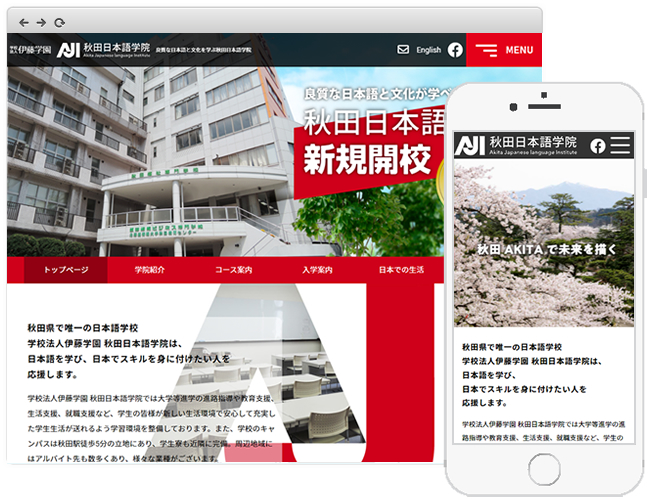 学校法人伊藤学園 秋田日本語学院様(秋田県秋田市中通四丁目3-11)のホームページを作成しました。秋田日本語学院様は、学校法人伊藤学園様が新たに開校した、良質な日本語と文化が学べる日本語学校です。学校法人伊藤学園様のホームページ作成に続き、新設した学校のホームページをご用命頂き、お手伝いさせて頂きました。
