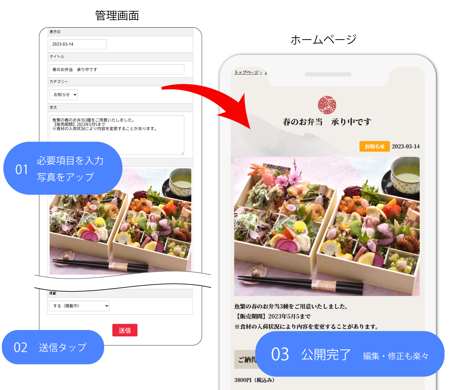 季節ごとのお料理やお弁当などの情報発信に簡単更新くんを利用されています。