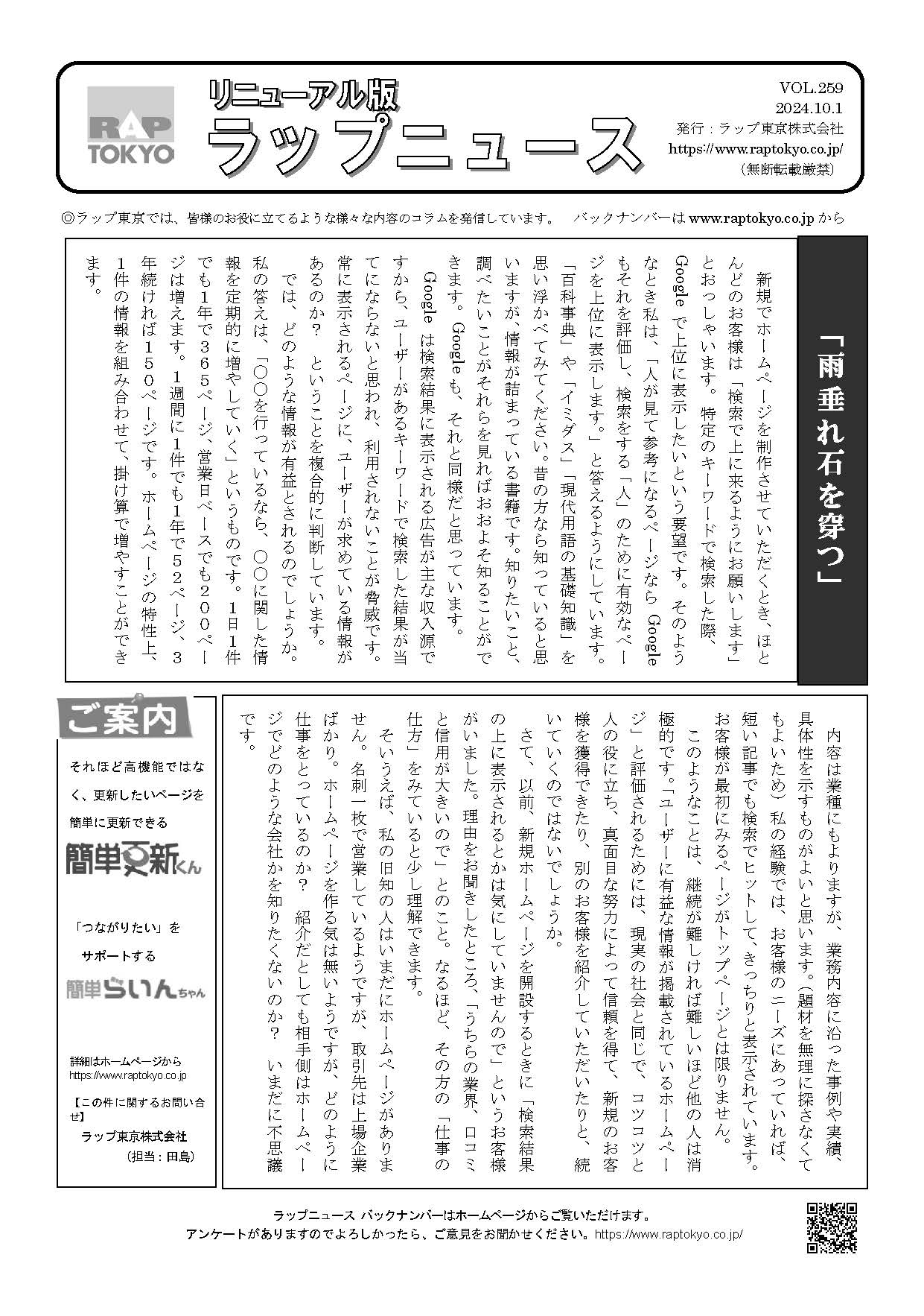 このようなことは、継続が難しければ難しいほど他の人は消極的です。「ユーザーに有益な情報が掲載されているホームぺージ」と評価されるためには、現実の社会と同じで、コツコツと人の役に立ち、真面目な努力によって信頼を得て、新規のお客様を獲得できたり、別のお客様を紹介していただいたりと、続いていくのではないでしょうか。