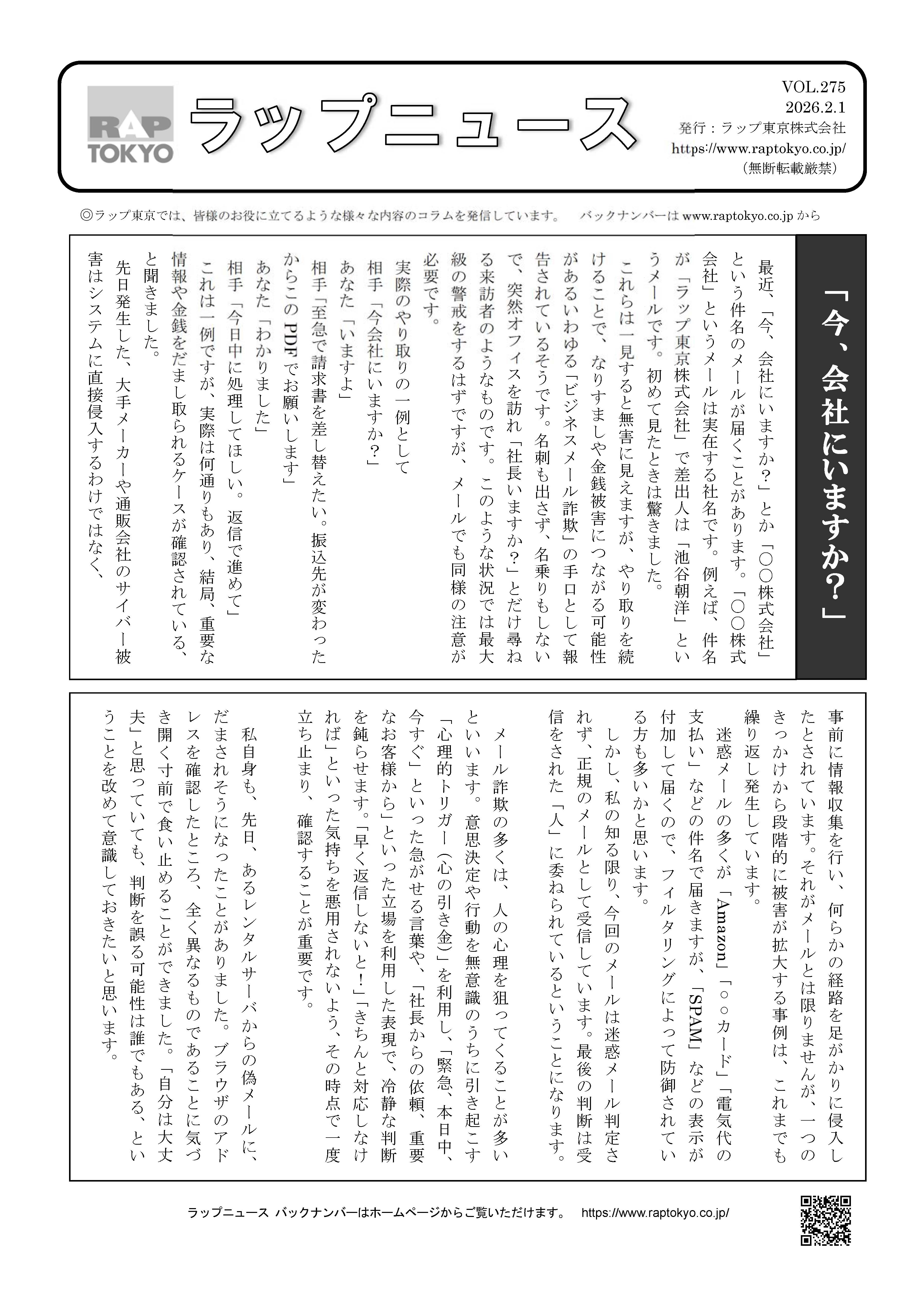 最近、「今、会社にいますか?」とか「○○株式会社」という件名のメールが届くことがあります。「○○株式会社」というメールは実在する社名です。例えば、件名が「ラップ東京株式会社」で差出人は「池谷朝洋」というメールです。初めて見たときは驚きました。