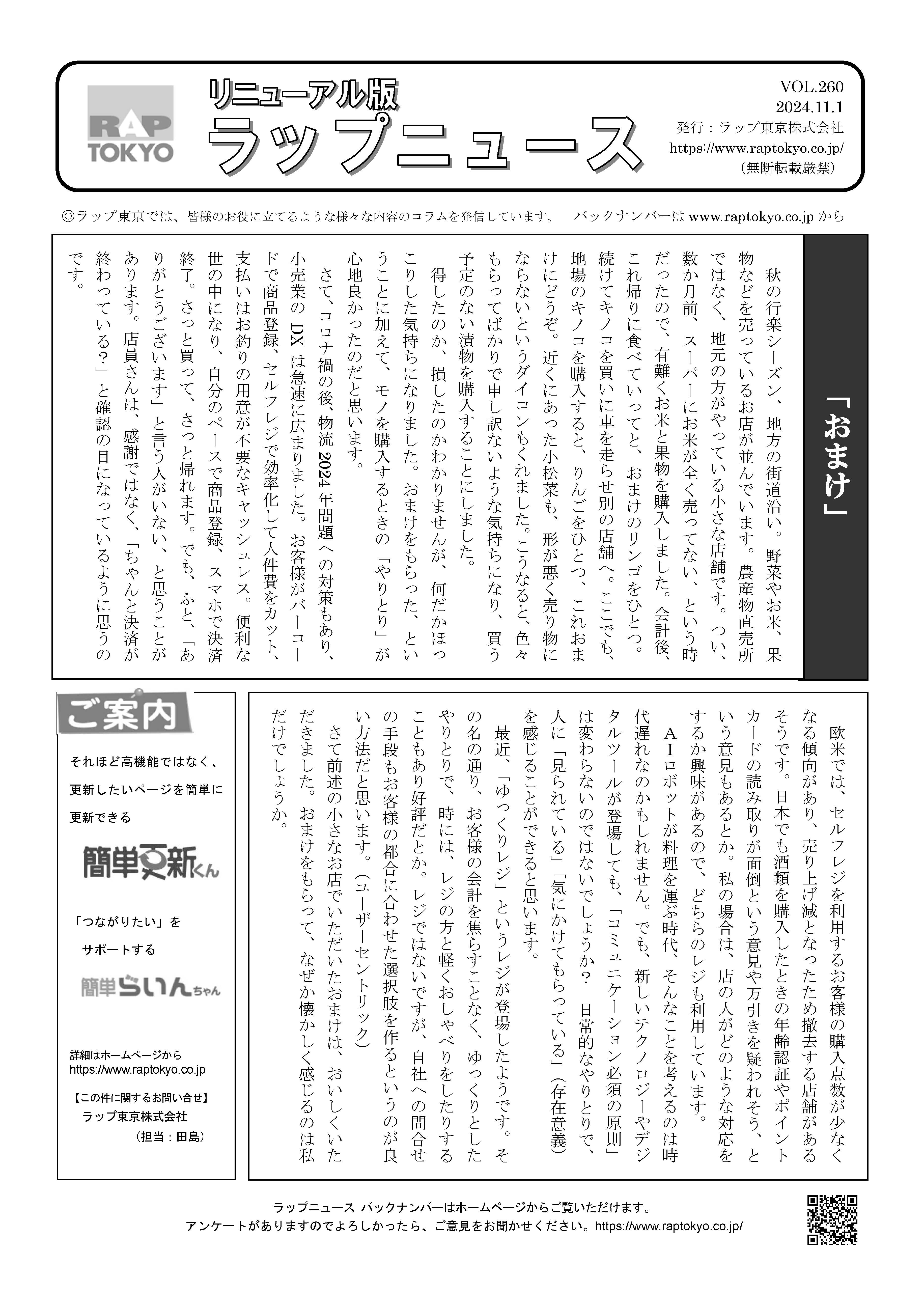 さて、コロナ禍の後、物流2024年問題への対策もあり、小売業のDXは急速に広まりました。お客様がバーコードで商品登録、セルフレジで効率化して人件費をカット、支払いはお釣りの用意が不要なキャッシュレス。便利な世の中になり、自分のペースで商品登録、スマホで決済終了。さっと買って、さっと帰れます。でも、ふと、「ありがとうございます」と言う人がいない、と思うことがあります。店員さんは、感謝ではなく、「ちゃんと決済が終わっている?」と確認の目になっているように思うのです。
