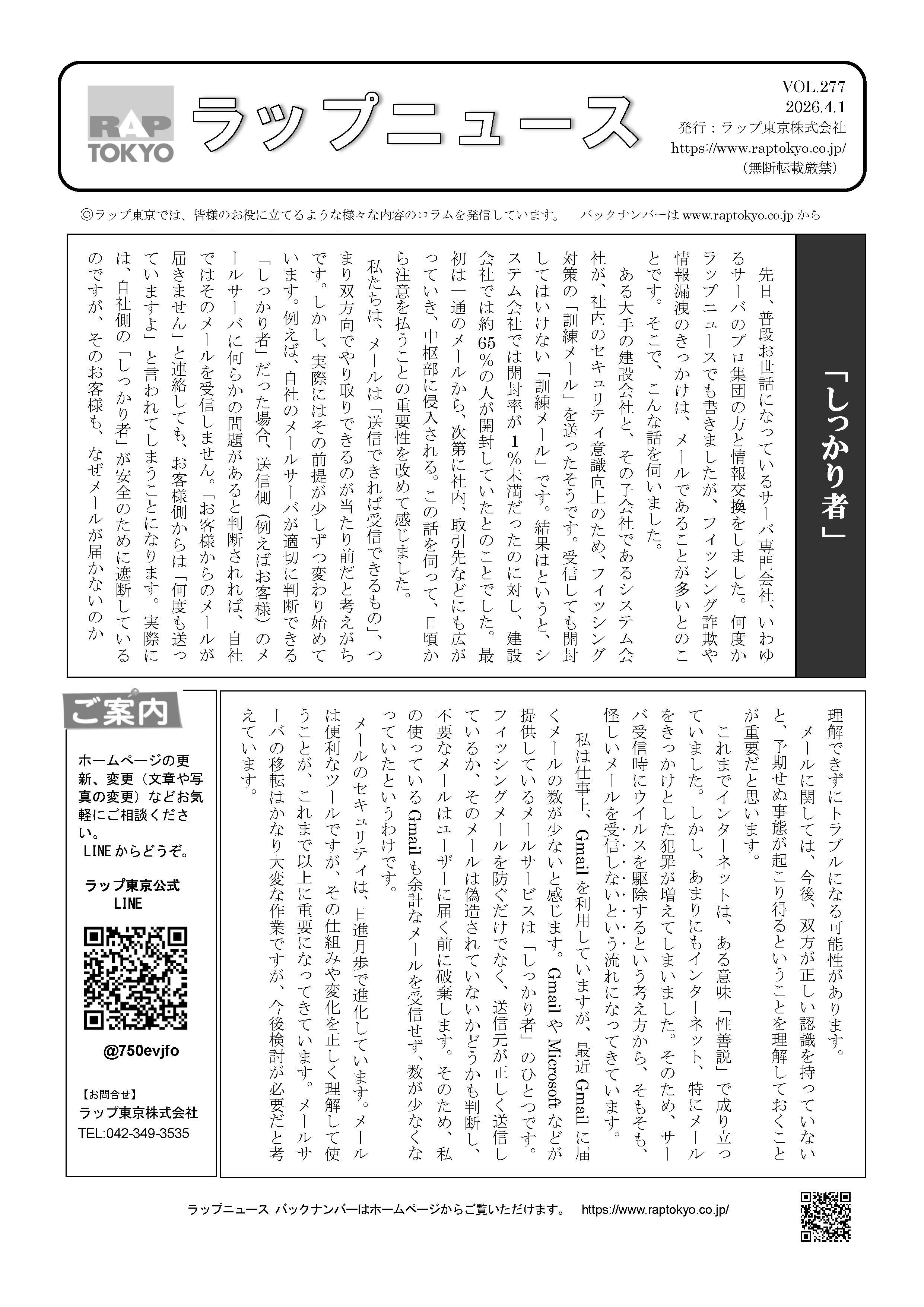 先日、普段お世話になっているサーバ専門会社、いわゆるサーバのプロ集団の方と情報交換をしました。何度かラップニュースでも書きましたが、フィッシング詐欺や情報漏洩のきっかけは、メールであることが多いとのことです。そこで、こんな話を伺いました。